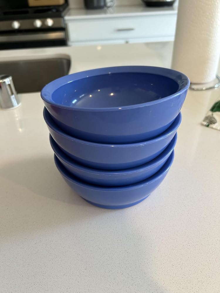 This set of non spill plastic bowls are easy to use, and they’re easy to clean. They’re durable, and they’re stylish. They’re un breakable, and they’re lightweight. They come in assorted colors, and they’re a small size. I would recommend this set of plastic bowls.
